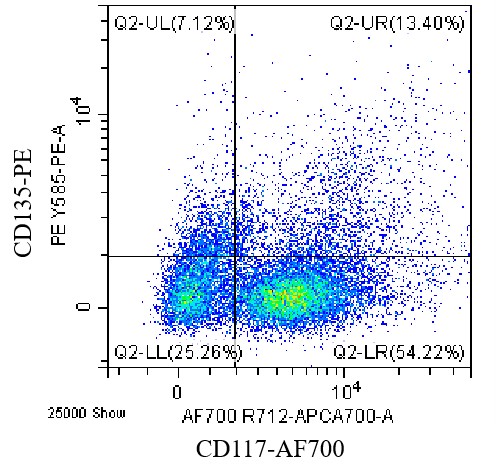 • Staining of bone marrow cells from C57BL/6 mice using AF700 Anti-CD117 Antibody and PE Anti-CD135/Flt3 Antibody (Clone: A2F10) (Product No.: G0767). Analyzed data are derived from large forward/side scatter cells.