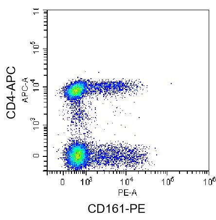 • Staining of normal human peripheral blood mononuclear cells (PBMCs) using APC Anti-CD4 Antibody and PE Anti-CD161 Antibody (Clone: HP-3G10) (Product No.: H0332). Analyzed data are derived from lymphocytes.