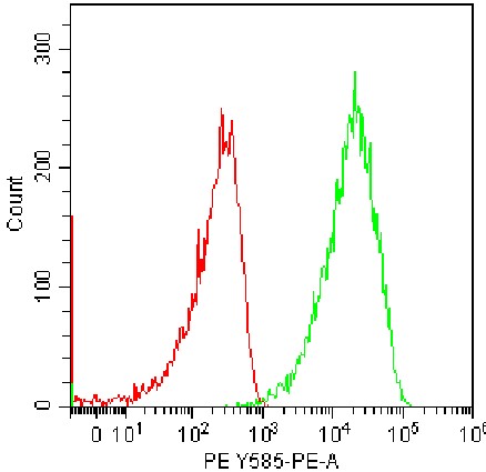 • Staining of HeLa cell line cells using PE CD171 Antibody (Clone: D8A14) (Selleck Cat#: H3257) (Green, Red: Blank Control). Analyzed data are derived from total live cells.
