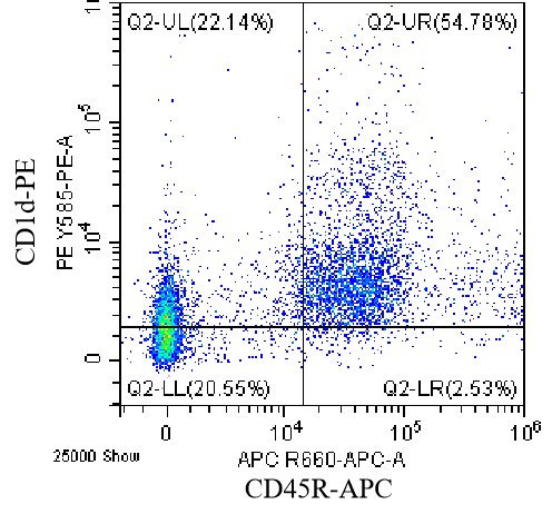 • Staining of splenic lymphocytes from C57BL/6 mice using FITC Anti-CD45R Antibody and PE Anti-CD1d Antibody (Clone: 1B1) (Product No.: G1712). Analyzed data are derived from live lymphocytes.