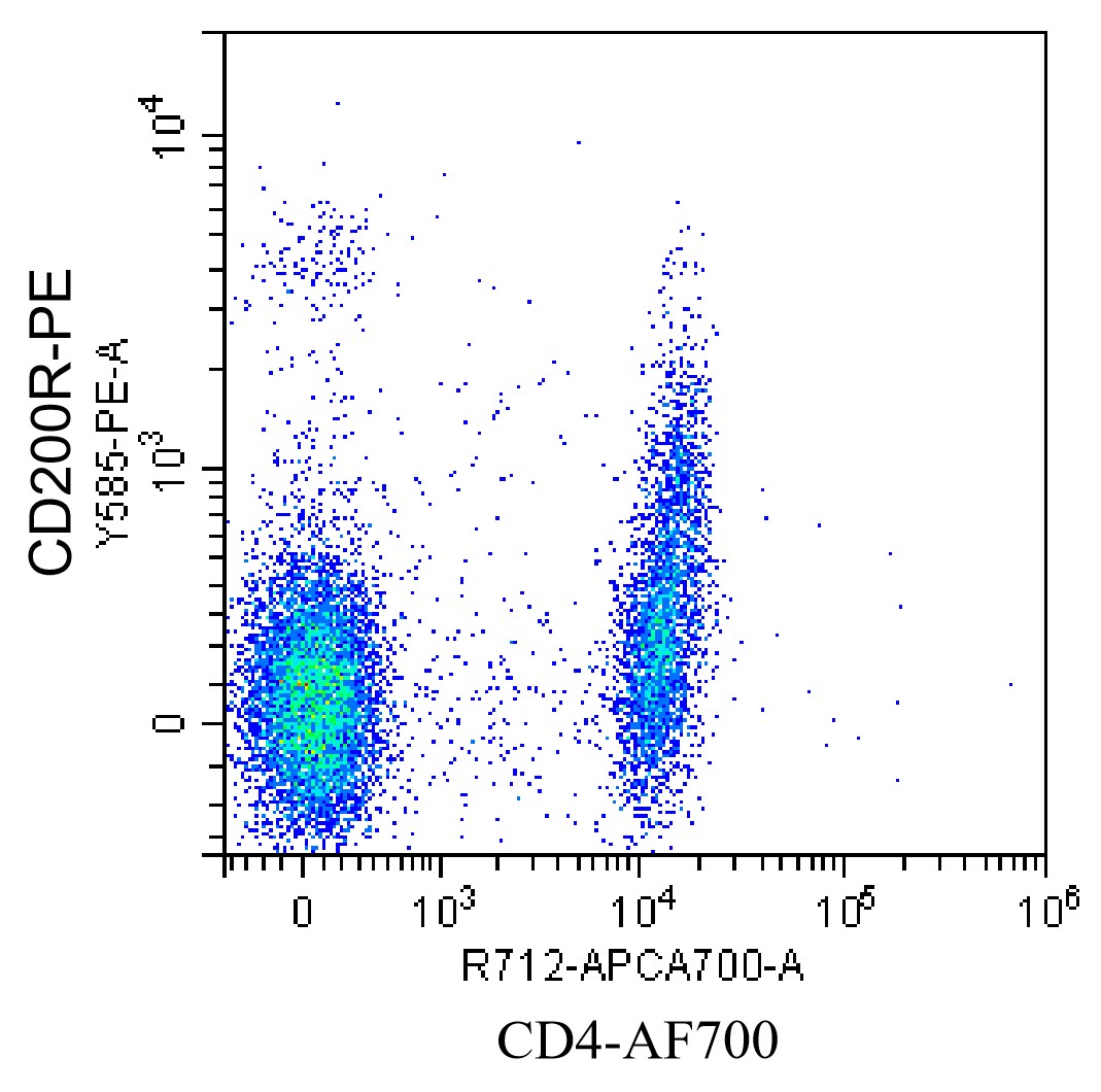 • Staining normal human peripheral blood mononuclear cells (PBMCs) with PE CD200R Antibody (Clone: OX108) (Product Number: H2882), and FITC CD4 Antibody. Analysis was performed on lymphocytes.