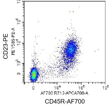 • Staining of splenic lymphocytes from C57BL/6 mice using AF700 Anti-CD45R Antibody and PE Anti-CD23 Antibody (Clone: B3B4) (Product No.: G4127). Analyzed data are derived from live lymphocytes.