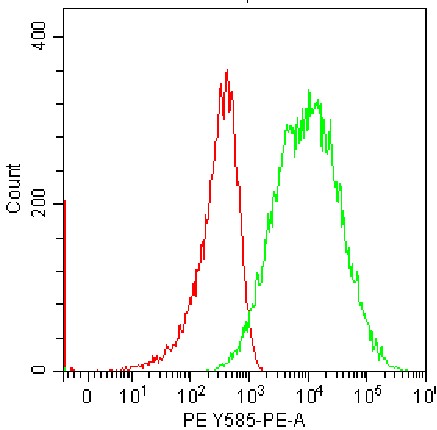 • Staining of J774A.1 cell line cells using PE CD284/TLR4 Antibody (Clone: UT41) (Product No.: G0662) (Green, Red: Blank Control). Analyzed data are derived from total live cells.