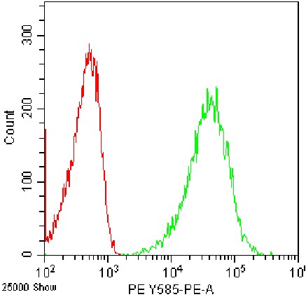 • Staining of permeabilized J774A.1 cell line cells (permeabilized using fixation/permeabilization buffer) using PE Anti-CD68 Antibody (Clone: FA-11) (Product No.: G0497) (green) and unstained control (red). Analyzed data are derived from total cells.