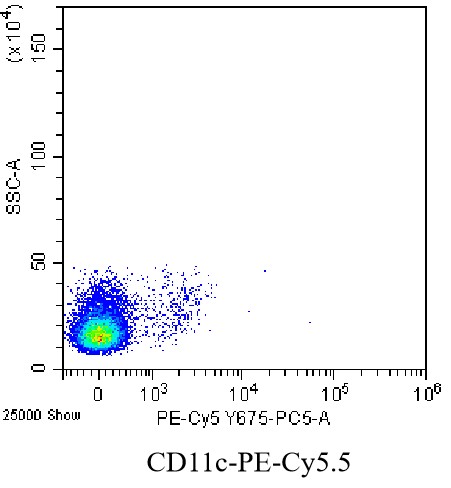 • Staining of C57BL/6 mouse splenic lymphocytes using PE-Cy5.5 CD11c Antibody (Clone: N418) (Catalog Number: G0103). Analysis data derived from total live cells.