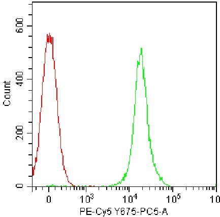 • Staining of splenic lymphocytes from C57BL/6 mice using PE-Cy5.5 Anti-CD45 Antibody (Clone: 30-F11) (Cat. No. G0028) (green) and unstained control (red). Analyzed data are derived from total live cells.