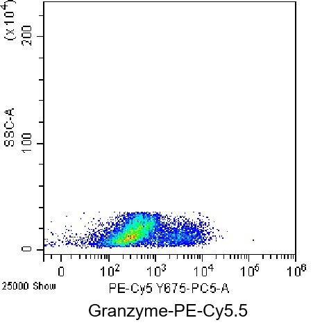 • Intracellular staining of fixed/permeabilized normal human peripheral blood mononuclear cells (PBMCs) using PE-Cy5.5 Anti-Granzyme B Antibody (Clone: GB11) (Product No.: H0403). Analyzed data are derived from cells gated on lymphocytes.