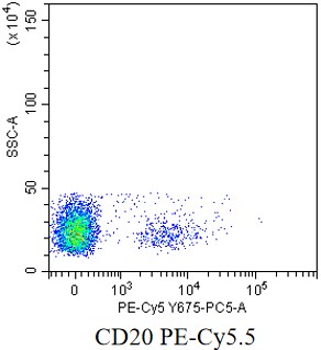 • Staining of normal human peripheral blood mononuclear cells (PBMCs) using PE-Cy5.5 Anti-Human CD20 Antibody (Clone: 2H7) (Product No.: H1168). Analyzed data are derived from lymphocytes.