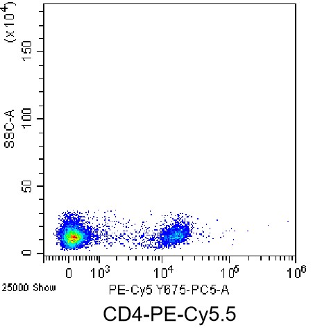 • Staining of splenic lymphocytes from C57BL/6 mice using PE-Cy5.5 Anti-Mouse CD4 Antibody (Clone: GK1.5) (Product No.: G4153). Analyzed data are derived from live lymphocytes.