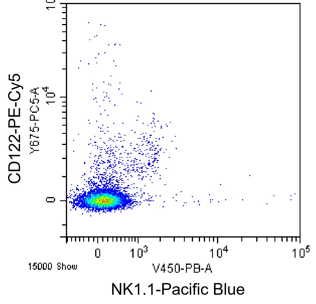 • Staining C57BL/6 mouse splenocytes with PB NK1.1 Antibody and PE-Cy5 CD122/IL-2Rβ Antibody (Clone: TM-β1) (Product Number: G2978). Analysis was performed on total cells.