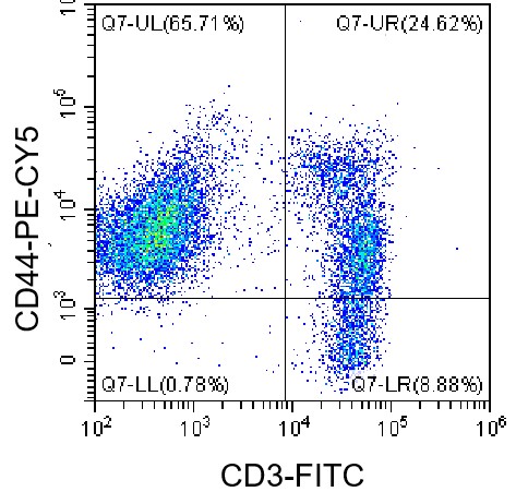 • Staining of splenic lymphocytes from C57BL/6 mice using FITC Anti-CD3 Antibody and PE-Cy5 Anti-CD44 Antibody (Clone: IM7) (Cat. No. G0083). Analyzed data are derived from total live cells.
