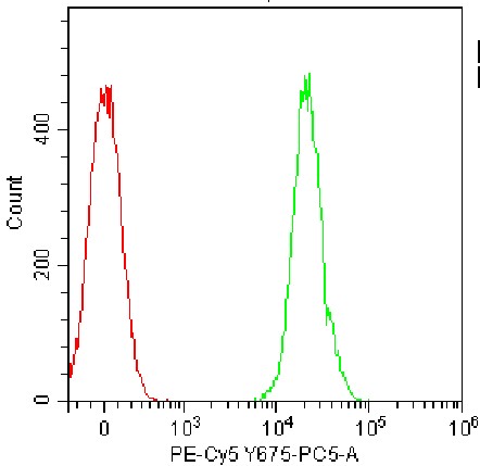 • Staining of splenic lymphocytes from C57BL/6 mice using PE-Cy5 Anti-CD45 Antibody (Clone: 30-F11) (Cat. No. G0023) (green) and unstained control (red). Analyzed data are derived from total live cells.
