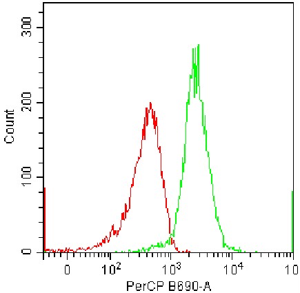• Staining of permeabilized Jurkat cells using fixation/permeabilization buffer with PE-Cy5 anti-human CXCR4 Antibody (Clone: UMB2) (Product Code: G4928) (green, red is unstained control). Analysis data derived from total live cells.