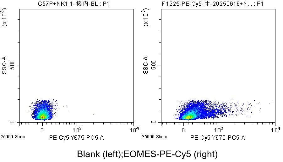 • Intracellular nuclear staining of mouse spleen cells permeabilized using Foxp3/Transcription Factor Staining Buffer Set (Permeabilization Buffer) using PE-Cy5 Anti-EOMES Antibody (Clone: Dan11mag) (Product No.: G2828) (Left: Blank Control; Right: EOMES-PE-Cy5). Analyzed data are derived from cells gated on lymphocytes.