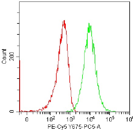 • Staining of J774A.1 cell line cells using PE-Cy5 F4/80 Antibody (Clone: BM8) (Product No.: G0068) (Green, Red: Blank Control). Analyzed data are derived from total live cells.