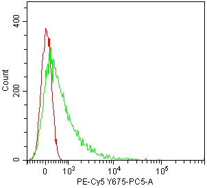 • Staining of HEK-293F cell line cells transfected with pEnCMV-TNFRSF9(human)-3×FLAG-WPRE-SV40-Neo plasmid and permeabilized using fixation/permeabilization buffer using PE-Cy5 Anti-Human CD137 Antibody (Clone: 4B4-1) (Product No.: H3803) (Green, red is blank cells). Analyzed data are derived from total cells.