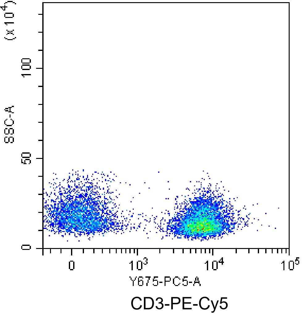 • Staining normal human peripheral blood mononuclear cells (PBMCs) with PE-Cy5 human CD3 Antibody (Clone: UCHT1) (Product Number: H4358). Analysis was performed on lymphocytes.