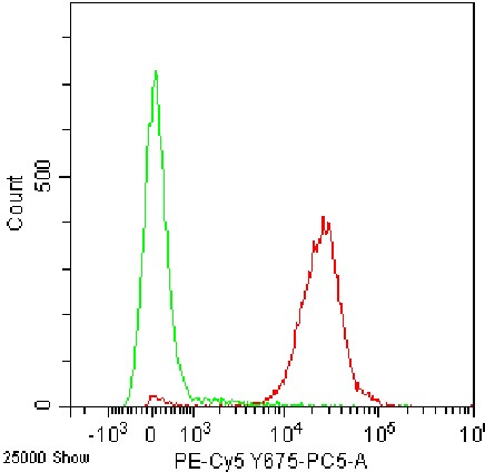 • Staining of normal human peripheral blood mononuclear cells (PBMCs) using PE-Cy5 Anti-Human CD45 Antibody (Clone: HI30) (Product No.: H0098) (red, green is unstained control). Analyzed data are derived from lymphocytes.