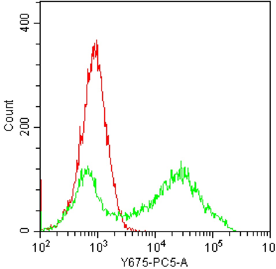 • Staining HEK-293F cells transfected with pCMV-SELE(human)-3×FLAG-Neo plasmid and fixed/permeabilized with fixation/permeabilization buffer with PE-Cy5 Human CD62E Antibody (Clone: 68-5H11) (Product Number: H2693) (green, red is unstained control). Analysis was performed on total cells.