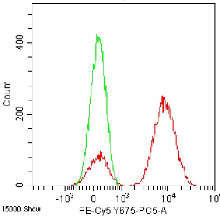 • Staining of Jurkat cell line cells using PE-Cy5 Anti-Human CD90 Antibody (Clone: 5E10) (Product No.: H0308) (red, green is unstained control). Analyzed data are derived from live cells.