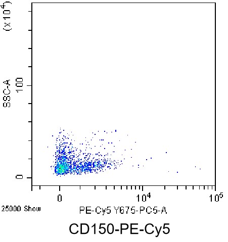 • Staining of splenic lymphocytes from C57BL/6 mice using PE-Cy5 Anti-Mouse CD150/SLAM Antibody (Clone: TC15-12F12.2) (Product No.: G0653). Analyzed data are derived from total cells.