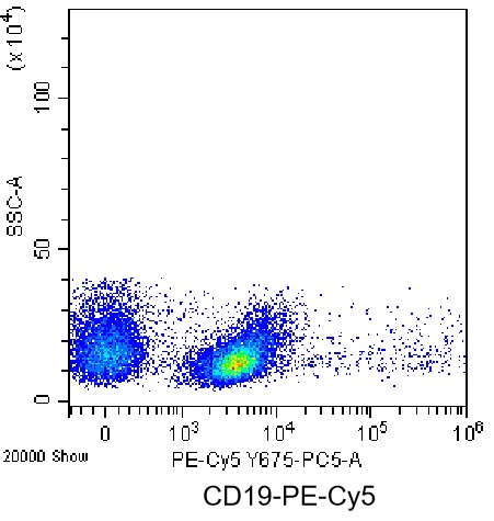 • Staining of splenic lymphocytes from C57BL/6 mice using PE-Cy5 Anti-Mouse CD19 Antibody (Clone: 1D3) (Product No.: G4388). Analyzed data are derived from live lymphocytes.