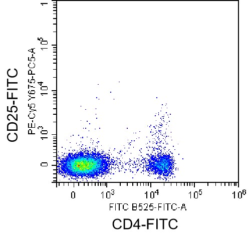 • Staining of C57BL/6 mouse splenic lymphocytes using FITC CD4 Antibody and PE-Cy5 Mouse CD25/IL-2Rα Antibody (Clone: PC61.5) (Catalog Number: G4208). Analysis data derived from live lymphocytes.