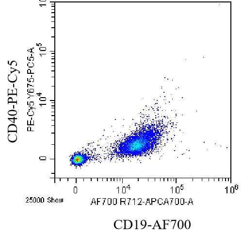 • Staining of splenic lymphocytes from C57BL/6 mice using AF700 Anti-CD19 Antibody and PE-Cy5 Anti-Mouse CD40 Antibody (Clone: 1C10) (Product No.: G0518). Analyzed data are derived from total cells.