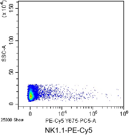 • Staining of C57BL/6 mouse splenic lymphocytes with PE-Cy5 Anti-Mouse NK1.1 Antibody (Clone: PK136) (Product No.: G4253). Analysis data derived from live lymphocytes.