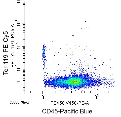 • Staining of unlysed red bone marrow cells from C57BL/6 mice using PB Anti-CD45 Antibody and PE-Cy5 Anti-Mouse Ter-119 Antibody (Clone: TER-119) (Product No.: G4358). Analyzed data are derived from live lymphocytes.