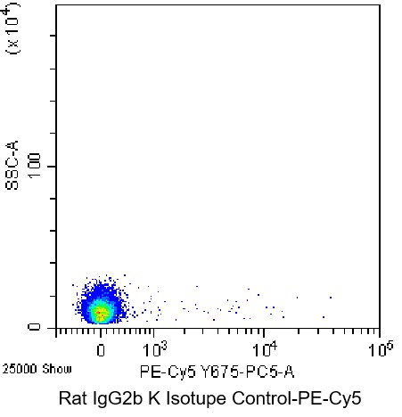 • Staining of C57BL/6 mouse splenic lymphocytes using PE-Cy5 Rat IgG2b κ Isotype Control Antibody (Clone: eB149/10H5) (Catalog Number: G0893). Analysis data derived from total cells.