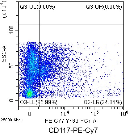• Staining of bone marrow cells from C57BL/6 mice using PE-Cy7 Anti-CD117/c-Kit Antibody (Clone: 2B8) (Product No.: G4054). Analyzed data are derived from total live cells.