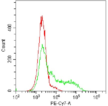 • Staining of permeabilized HEK-293F cells transfected with pEnCMV-FLT3-3×FLAG plasmid using fixation/permeabilization buffer with PE-Cy7 anti-human CD135/Flt3 Antibody (Clone: BV10A4H2) (Product Code: H0784) (green, red is unstained control). Analysis data derived from total cells.