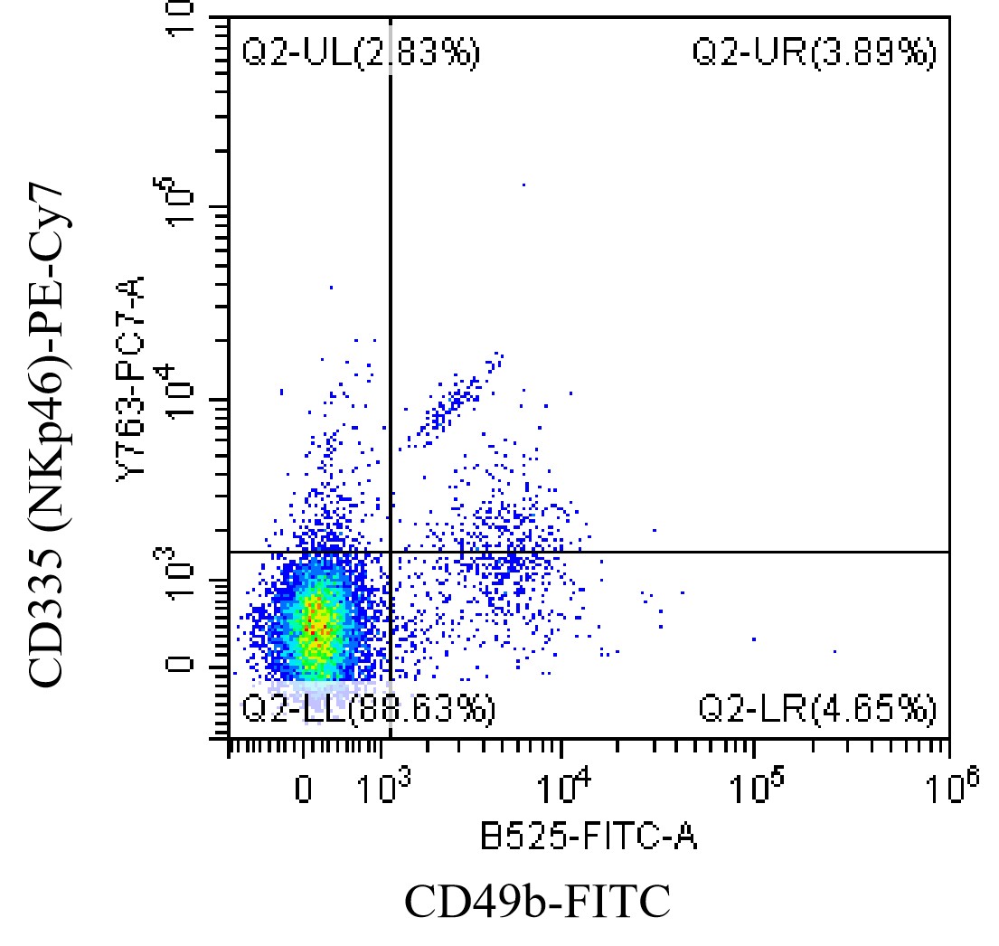 • Extracellular staining of splenocytes from C57BL/6 mice using FITC CD49b Antibody and PE-Cy7 CD335/NKp46 Antibody (Clone: 29A1.4) (Selleck Cat.: H3064). Analyzed data are derived from total live cells.
