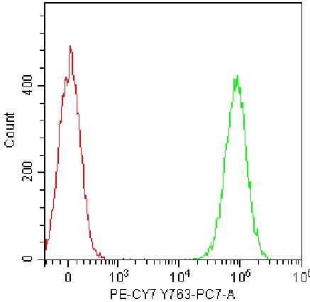 • Staining of splenic lymphocytes from C57BL/6 mice using PE-CY7 Anti-CD45 Antibody (Clone: 30-F11) (Cat. No. G0019) (green) and unstained control (red). Analyzed data are derived from total live cells.