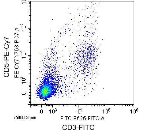 • Staining of splenic lymphocytes from C57BL/6 mice using FITC Anti-CD3 Antibody and PE-Cy7 Anti-CD5 Antibody (Clone: 53-7.3) (Product No.: G3484). Analyzed data are derived from total live cells.