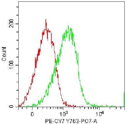 • Staining of fixed/permeabilized Jurkat cells using PE-Cy7 CXCR4 Antibody (Clone: UMB2) (Product No.: G4924) (Green, Red: Blank Control). Analyzed data are derived from total live cells.