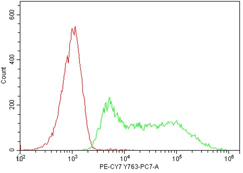 • Staining of fixed/permeabilized HEK-295F cells transfected with a plasmid containing a Flag tag using PE-CY7 Anti-DYKDDDDK Tag Antibody (Clone: L5) (Product No.: G2179) (green, red is blank control). Analyzed data are derived from total cells.