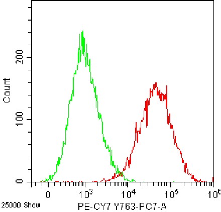 • Staining of MC/9 cell line using PE-CY7 Anti-FCER1A Antibody (Clone: MAR-1) (Product No.: G0754) (red, green is unstained control). Analyzed data are derived from total cells.
