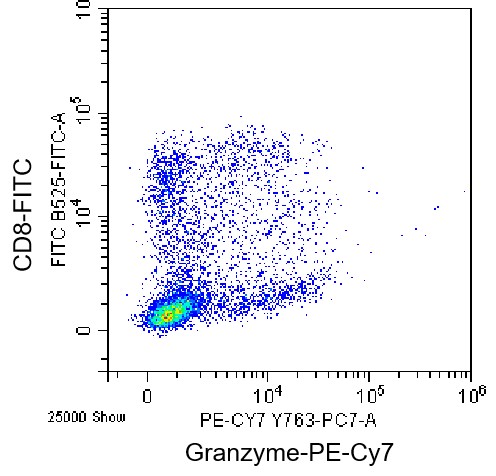 • Surface staining of normal human peripheral blood mononuclear cells (PBMCs) using FITC Anti-CD8a Antibody, washed, then fixed/permeabilized, followed by intracellular staining using PE-Cy7 Anti-Granzyme B Antibody (Clone: GB11) (Product No.: H0394). Analyzed data are derived from cells gated on lymphocytes.
