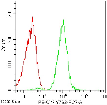 • Staining of normal human peripheral blood lysed with ammonium chloride red blood cell lysis buffer using PE-CY7 Anti-Human CD10 Antibody (Clone: HI10a) (Product No.: H1459) (green, red is blank control). Analyzed data are derived from total live cells.