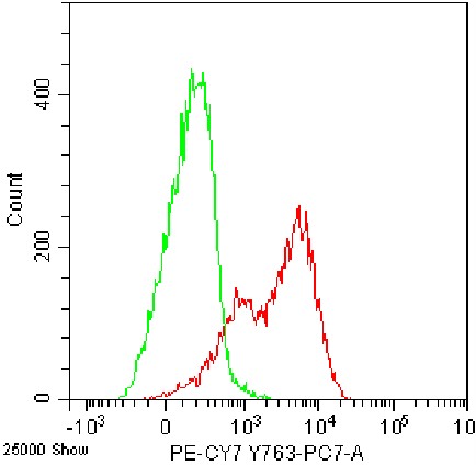 • Staining of Jurkat cell line cells using PE-Cy7 Anti-Human CD107a Antibody (Clone: H4A3) (Product No.: H0454) (Red, Green: Blank Control). Analyzed data are derived from live cells.