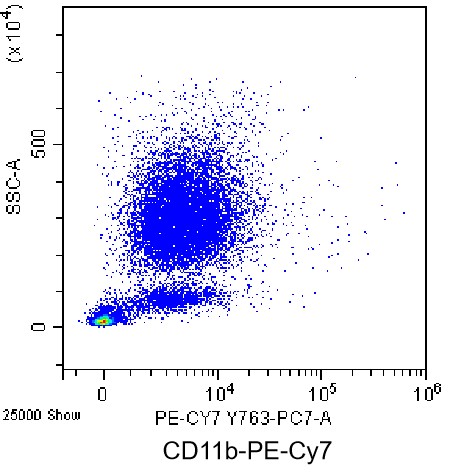 • Staining of normal human peripheral blood red blood cell-lysed using ammonium chloride lysis buffer using PE-Cy7 Anti-Human CD11b Antibody (Clone: CBRM1/5) (Product No.: H0079). Analyzed data are derived from total live cells.