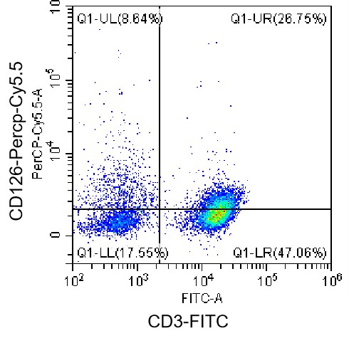 • Staining of normal human peripheral blood mononuclear cells (PBMCs) with FITC anti-human CD3 Antibody and PE-Cy7 anti-human CD126/IL-6Rα Antibody (Clone: UV4) (Product Code: H2569). Analysis data derived from live lymphocytes.