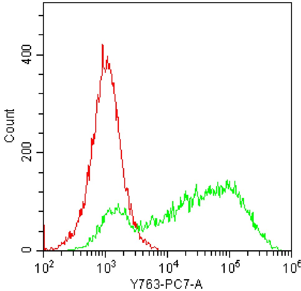 • Staining normal human peripheral blood mononuclear cells (PBMCs) stimulated with 5μg/mL PHA for 3 days with PE-Cy7 Human CD134/OX40 Antibody (Clone: Ber-ACT35 (ACT35)) (Product Number: H3469), and CD3 Antibody (green, red is unstained control). Analysis was performed on lymphocytes.