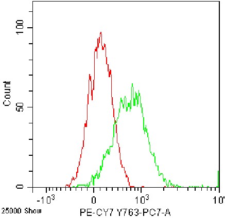 • Staining of normal human peripheral blood mononuclear cells (PBMCs) using PE-Cy7 Human CD141/Thrombomodulin Antibody (Clone: M80) (Selleck Cat#: H1969) (Green, Red: Blank Control). Analyzed data are derived from monocytes.
