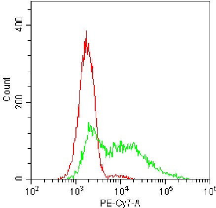 • Staining of permeabilized HEK-293F cells transfected with human CD169 plasmid using fixation/permeabilization buffer with PE-Cy7 anti-human CD169 Antibody (Clone: 7-239) (Product Code: H0949) (green, red is unstained control). Analysis data derived from total cells.