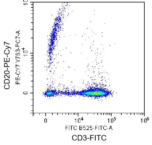 • Staining of normal human peripheral blood mononuclear cells (PBMCs) using FITC CD3 Antibody and PE-Cy7 Human CD20 Antibody (Clone: 2H7) (Selleck Cat#: H1159). Analyzed data are derived from lymphocytes.