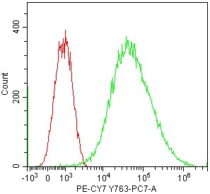 • Staining of normal human peripheral blood red blood cells using PE-CY7 Anti-Human CD235a Antibody (Clone: GA-R2 (HIR2)) (Product No.: H1054) (green, red is blank control). Analyzed data are derived from total cells.