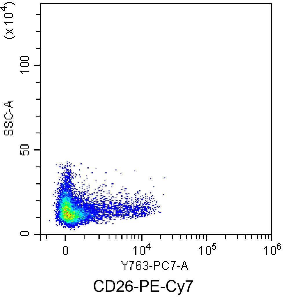 • Staining normal human peripheral blood mononuclear cells (PBMCs) with PE-Cy7 Human CD26 Antibody (Clone: BA5b) (Product Number: H3364). Analysis was performed on lymphocytes.
